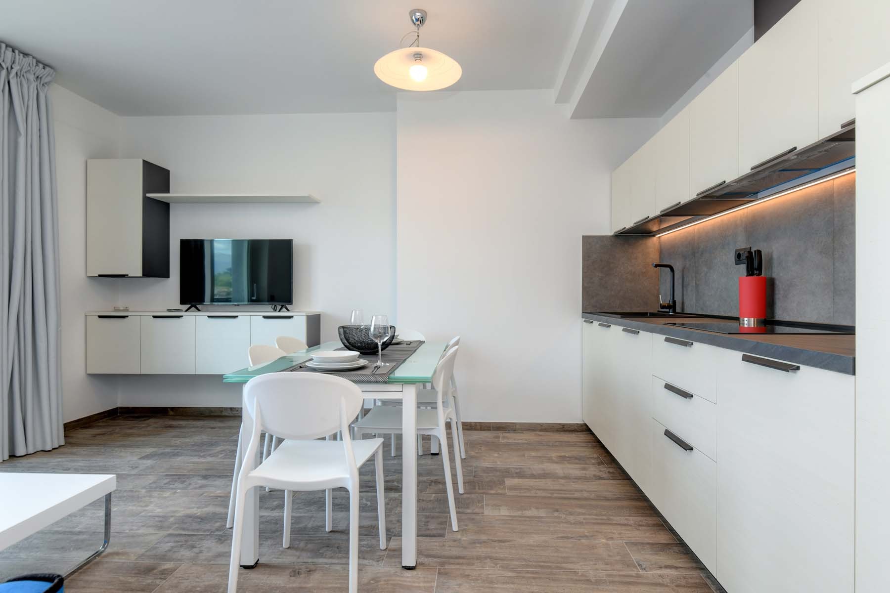 L'appartamento è composto da soggiorno con angolo cottura dotato di piano cottura, frigorifero, lavastoviglie e utensili, divano letto matrimoniale e TV a schermo piatto con canali satellitari, 1 camera da letto matrimoniale, 1 camera da letto con divano letto matrimoniale, bagno con doccia e set di cortesia e balcone con vista sul lago e sulle montagne circostanti